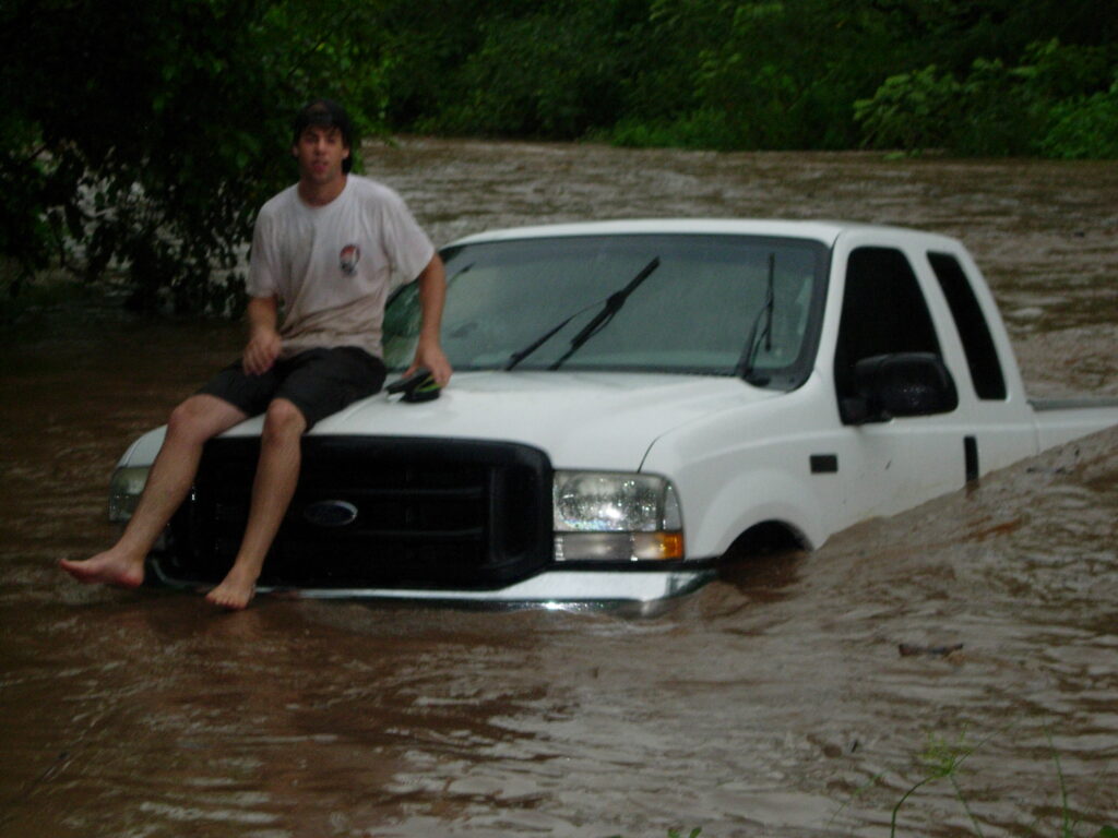 Dirty brown water drained from the bed. I opened the doors and river water poured out, leaving a layer of muddy silt on the floors. The was out of the water, but surely dead, I thought. I put it in park, looked at my sister shrugging my shoulders and tilting my head, then turned the key that was still in the ignition. Without so much as a sputter, the car started and came right back to life. Steam spewed out of the tailpipe and from around the engine, but that was it. The big white truck was ready to go. The rest of the crew jumped back in as if nothing had happened. We thanked the tractor driver and hurriedly went on our way as if trying to flee the scene before someone could report the incident.